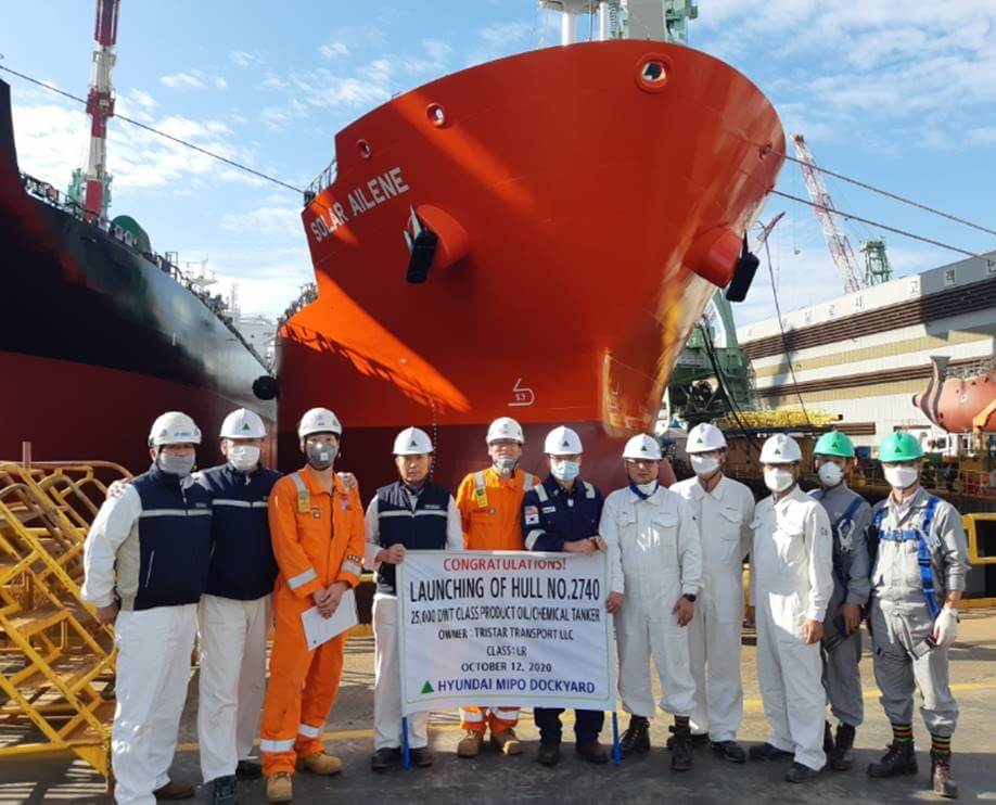 The Solar Ailene was launched today at the Hyundai Mipo Dockyard in Ulsan, South Korea. The vessel is named after Assistant Financial Planning Analyst Ailene Bravo who is based at the Head Office. Solar Ailene and Solar Sheridan will be delivered to the Shipping Team in January 2021. Sheridan Dela Rosa is a Senior Operations Supervisor. Both ladies won a raffle to have their names on two of the six new vessels ordered from the shipyard in 2018. The four other vessels have been delivered, namely Solar Sharna, Solar Nesrin, Solar Suzanne and Solar Skyler.