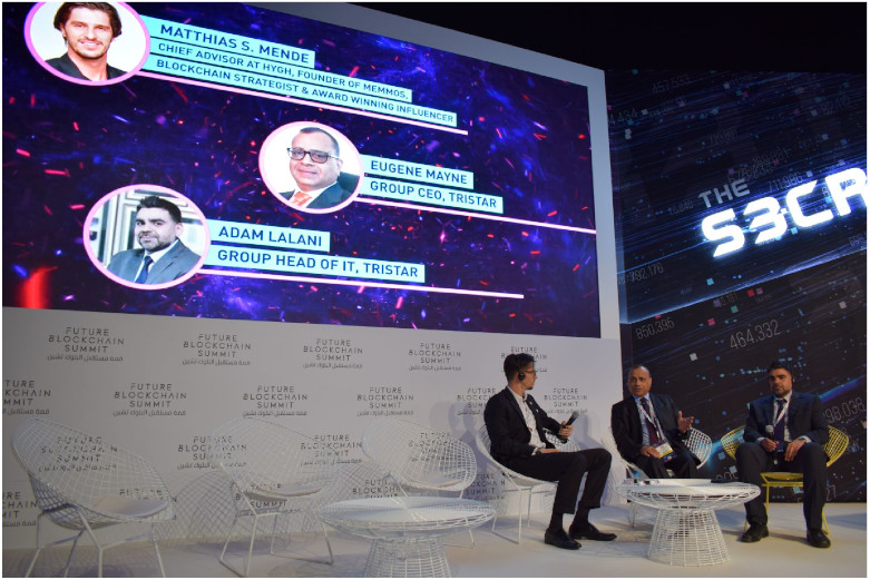 Tristar Group CEO Eugene Mayne (center) was invited to participate in a panel discussion at the Future Blockchain Summit held at Dubai World Trade Centre. Mr Mayne discussed Tristar’s digital strategy and pioneering work with Blockchain in the region and how Tristar is leveraging the technology to provide a world class service to its customers. Tristar has been recognized for being the first logistics company in the Gulf Cooperating Council (GCC) to have a fully live Blockchain platform, which provides customers with full real-time oversight on end-to-end warehousing and transportation processes. Blockchain technology is being leveraged at Tristar for business relationships as a single point of access for all documents/records, and the managing of trusted data with little or no use of paper.