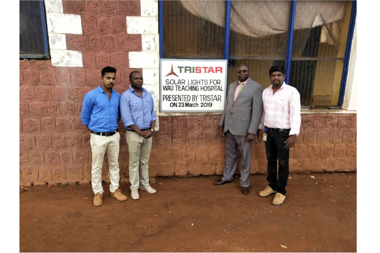 Solar Light System Installation atTristar South Sudan installed a solar light system as an emergency backup for the children’s ward at Wau Teaching Hospital, one of the only two functioning teaching hospitals in South Sudan. The emergency lighting was requested by the Ministry of Health to address power outages whenever the only generator at the hospital fails. The system has 36 LED lamps in two children’s wards with each ward consisting of four rooms, two toilets, and a pharmacy, store and veranda. The solar light system was inaugurated by the Health Minister of Wau County, Hon. Dr. James Patrice Ibrahim (2nd right).