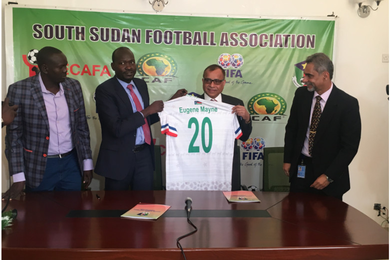 Group CEO Eugene Mayne signed an agreement with the South Sudan Football Association to sponsor foreign coach, Ait Al Hassen Abdalmalik, for the National Team. Mr. Mayne said it was Tristar’s way of continually engaging with the community of South Sudan and the youth in particular since sports is an excellent way of motivating the youth. Mr. Mayne was given his own jersey by South Sudan Football Association President Francis Amin at the signing ceremony witnessed by Tristar South Sudan Country Manager Ravneesh Aujla.