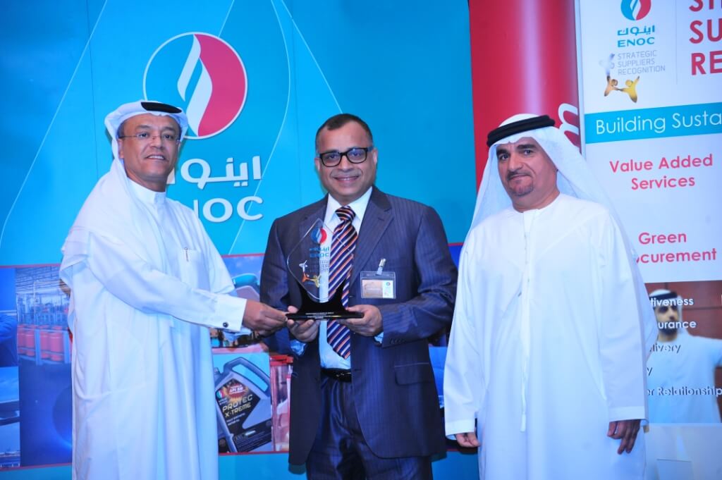 ENOC Procurement and Contracts has accorded Tristar the Gold Award as Strategic Supplier for 2011. Photo shows GCEO Eugene Mayne receiving the award from Zaid Al Qufaidi, Managing Director – ENOC Marketing Stream. With them is Abdulsalam Al Hammadi Director – ENOC Procurement and Contracts. The recognition and awarding ceremonies were held at the Grand Hyatt Hotel in Dubai on 10th June 2012.