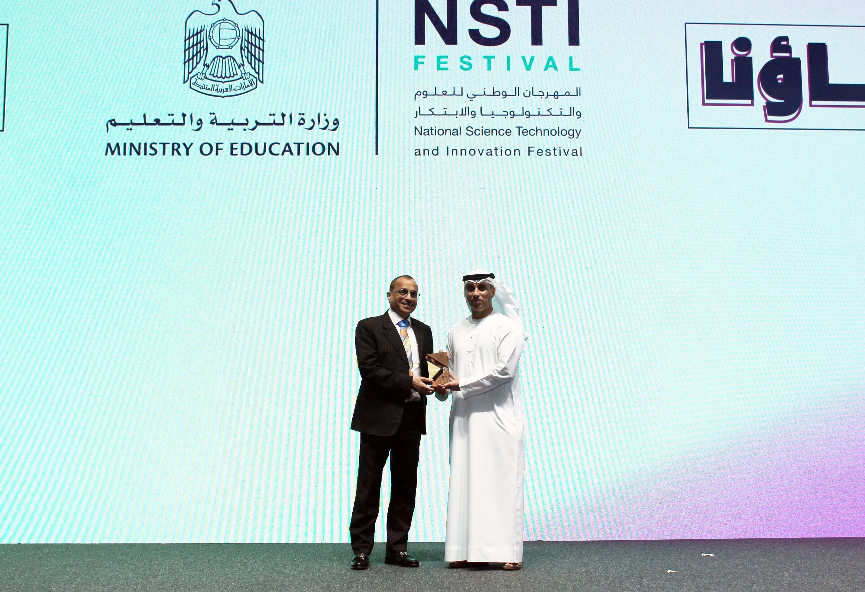 Tristar Group CEO Eugene Mayne pose with H.E. Ahmad Belhoul Al Falasi, UAE Minister of Education, with the Memento of Appreciation for supporting the National Science Technology and Innovation (NSTI) Festival held at Dubai Festival City from February 1 to 5.